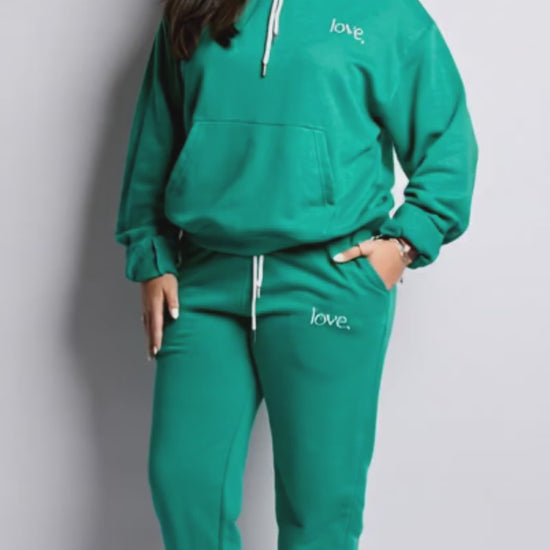 Crafted with heart and designed for comfort, these sweatpants feature pockets, a drawstring waist, fold over cuffs, love, logo print at pocket, in a saturated jade color.