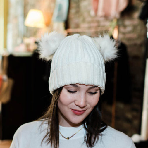 Let your inner critter out with this adorable rib hat with poms looking like puffy ears. 3 x 3 snow color knit rib with black-tipped cream pom poms.