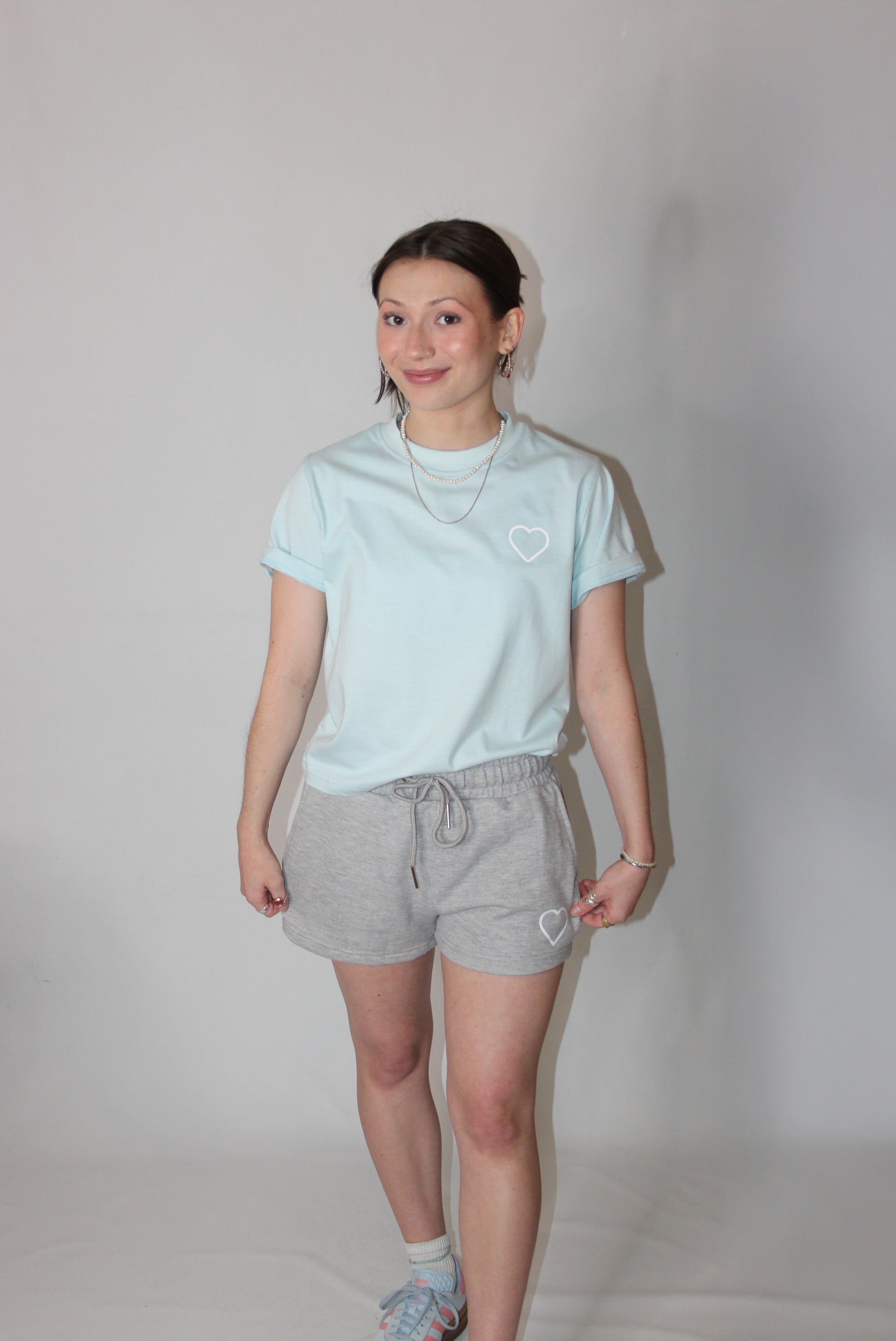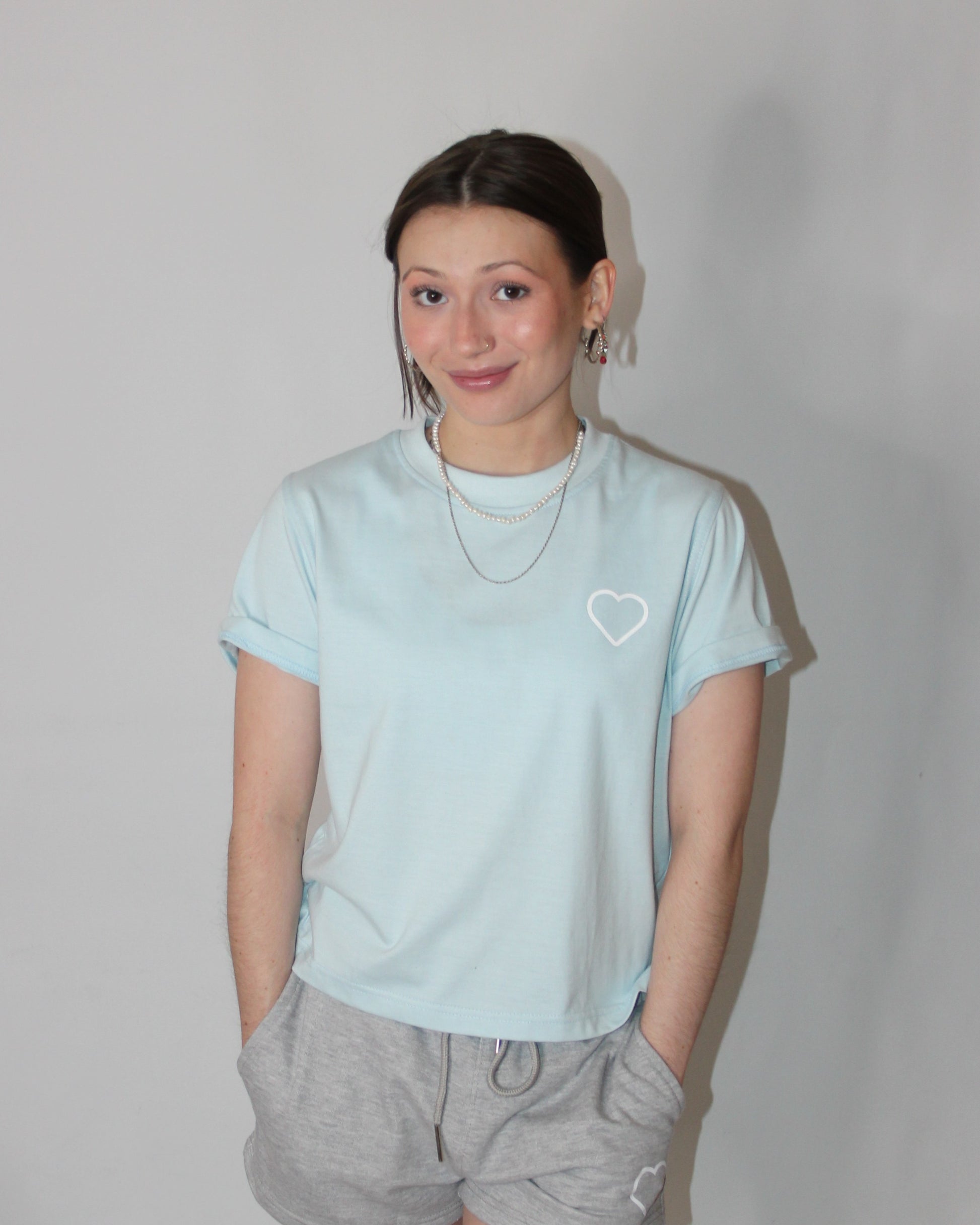 Soft baby blue tee with white heart print left chest.  Stay comfortable all day in breathable 100% cotton.
