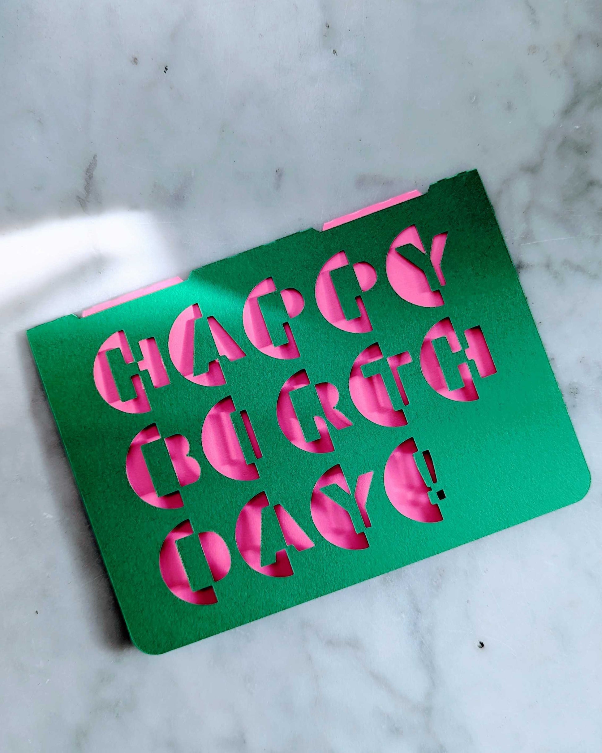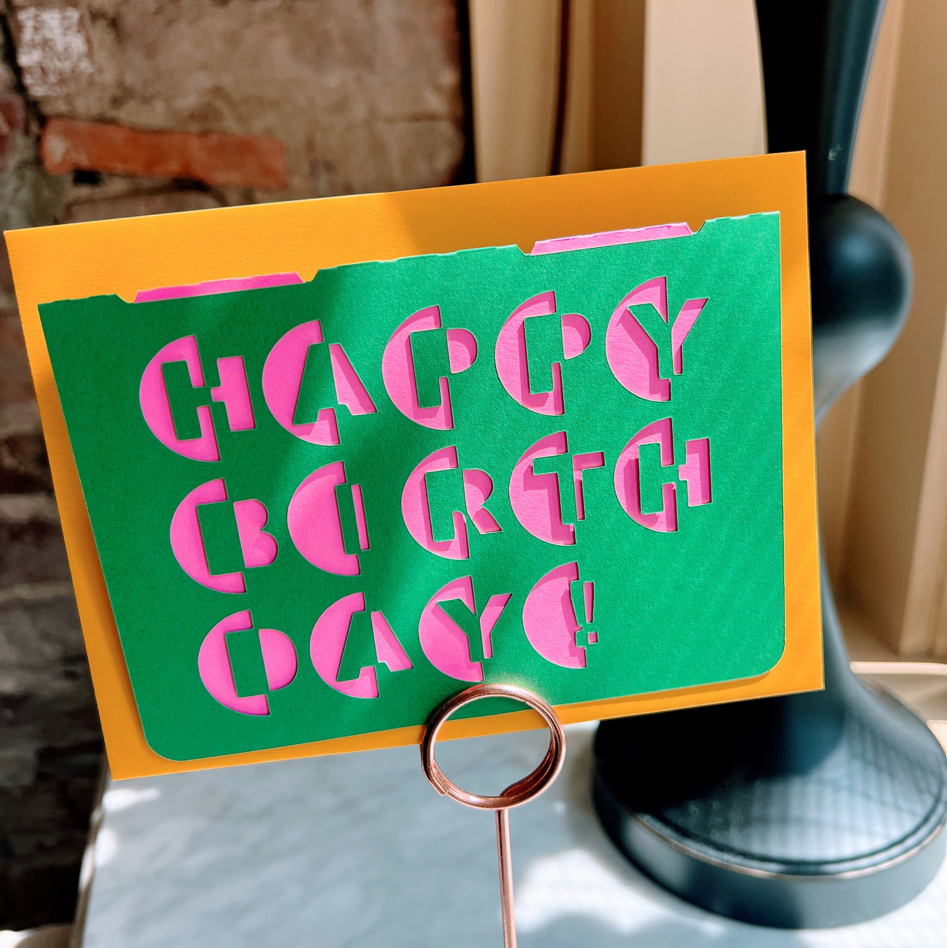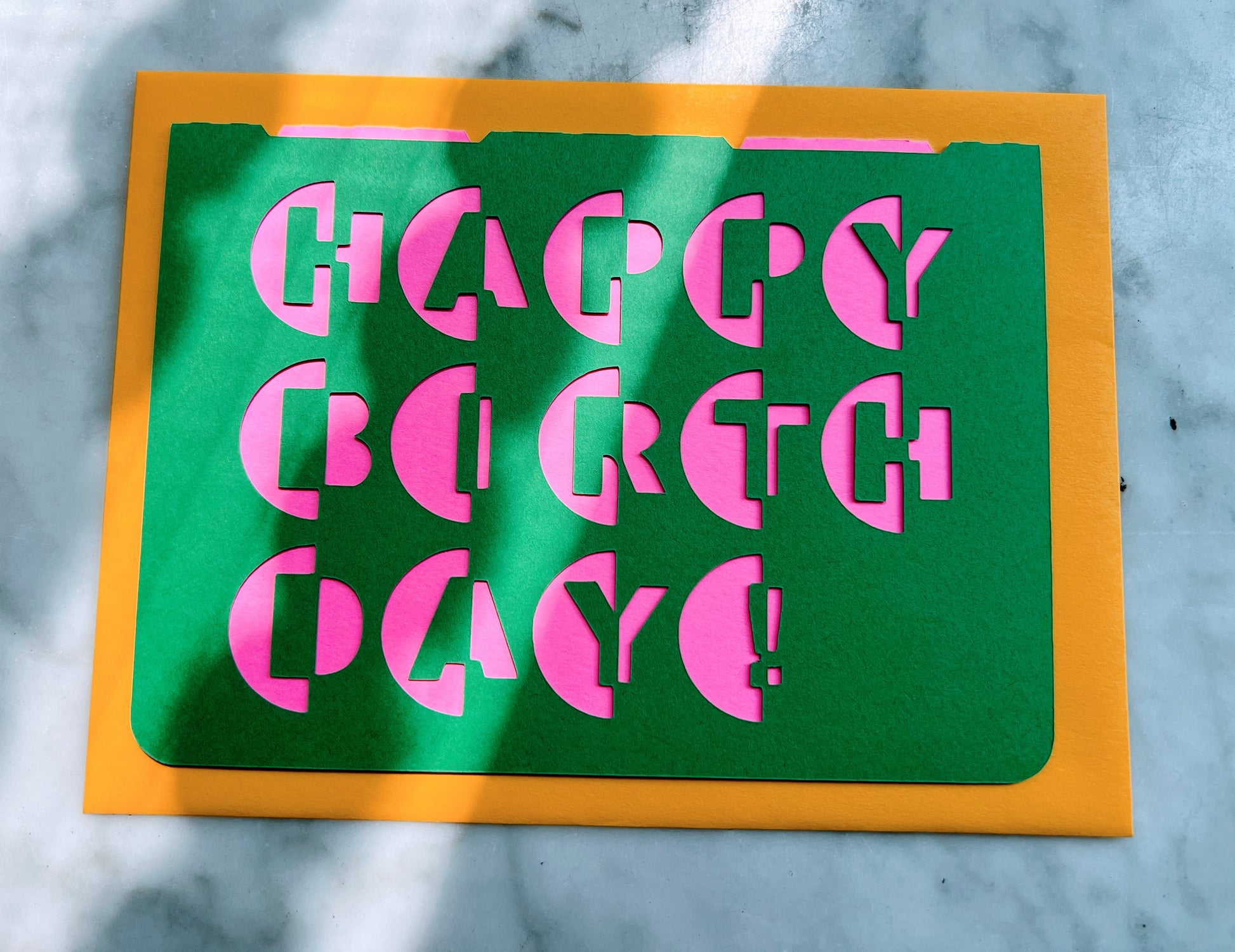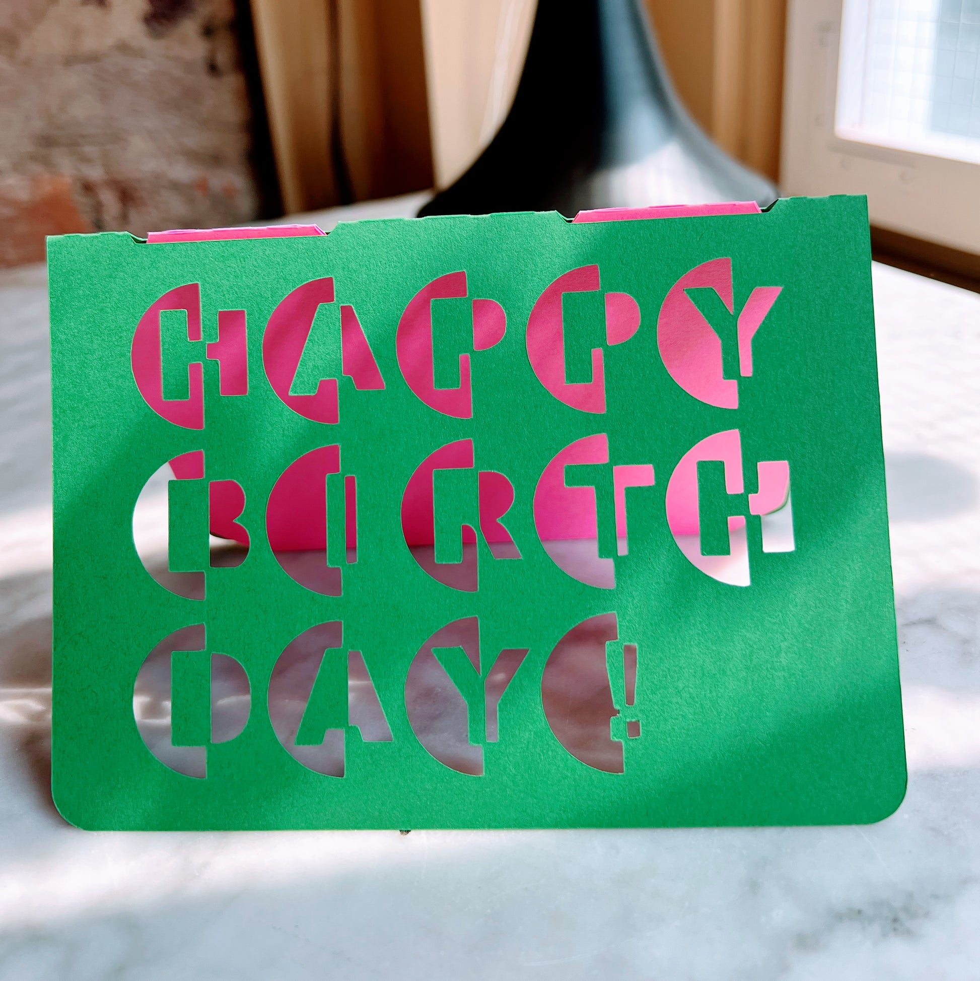 Fun way to say "happy birthday!" Unique half-circle design of cut out letters on grass green paper, with hot pink interior paper. Comes with sunny yellow envelope. Blank inside.