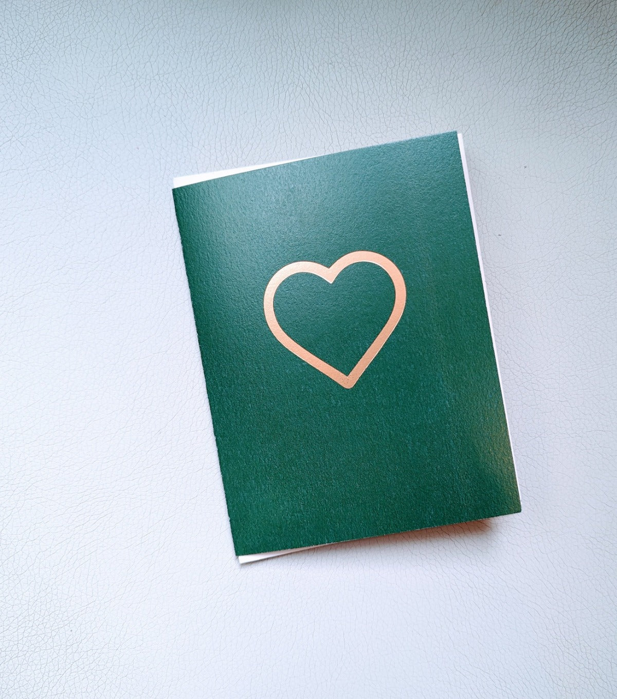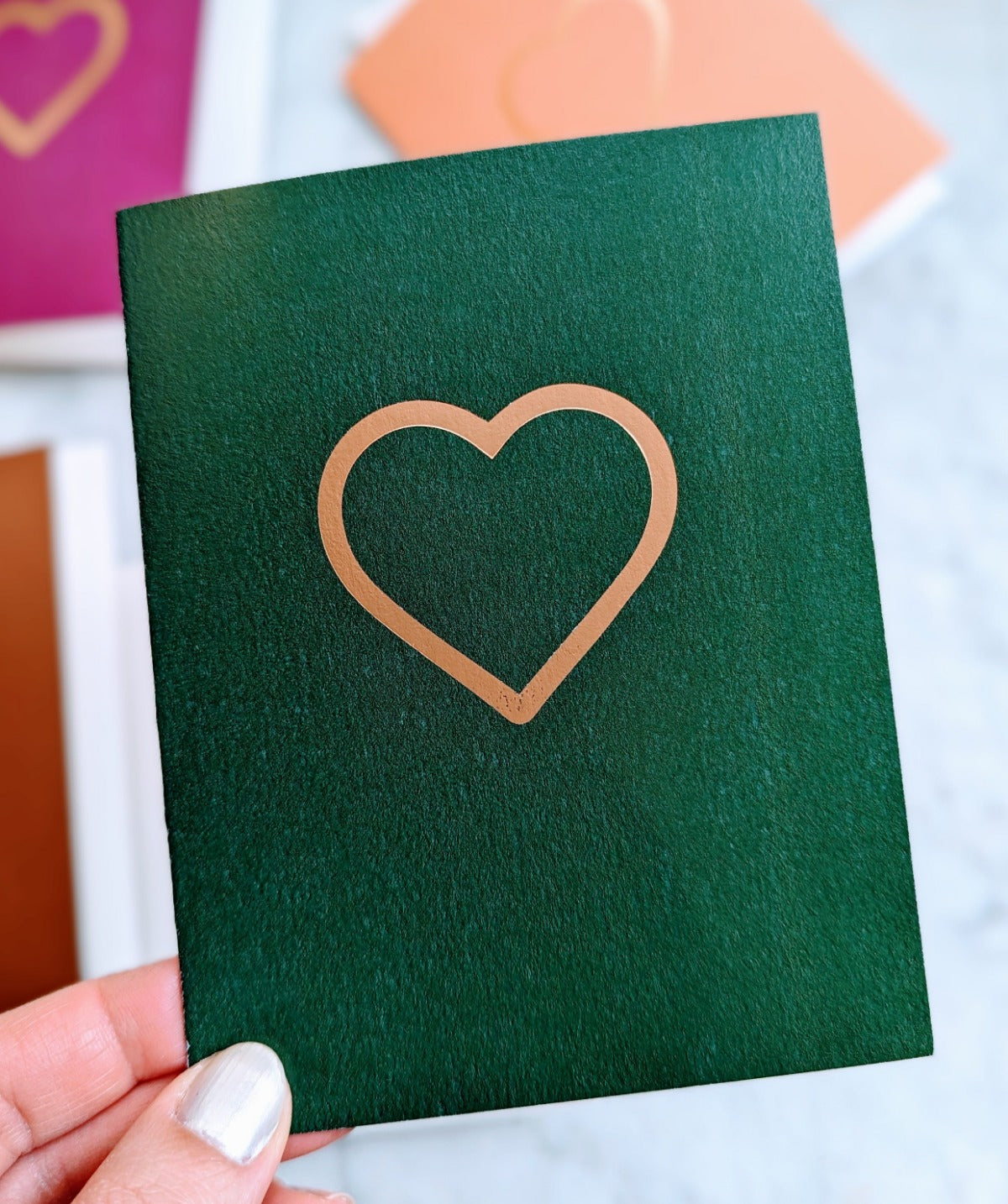 Bright copper foil heart set on a saturated jewel tone ground.  Paired with an envelope, blank inside.