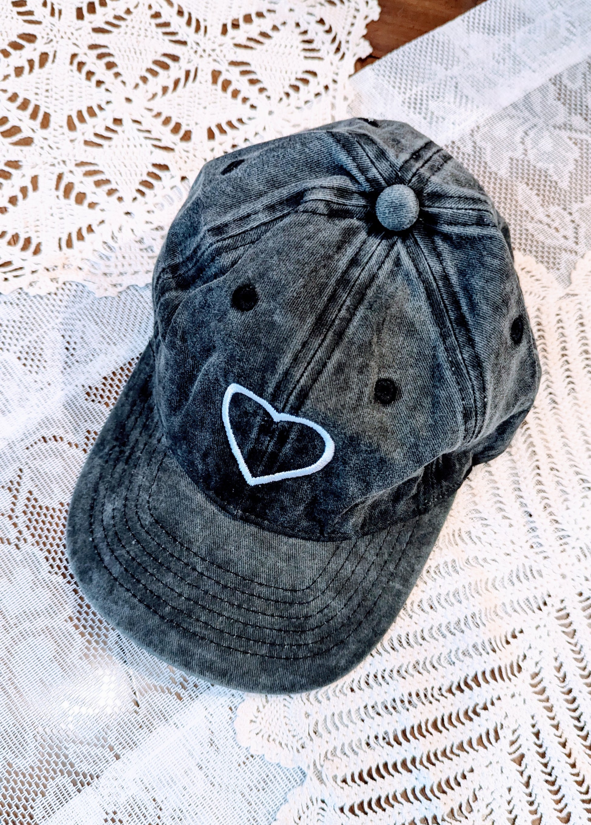 Casual vibes that send love every day.  Dad hat with white embroidered heart detail in a beautiful stone washed black shade.