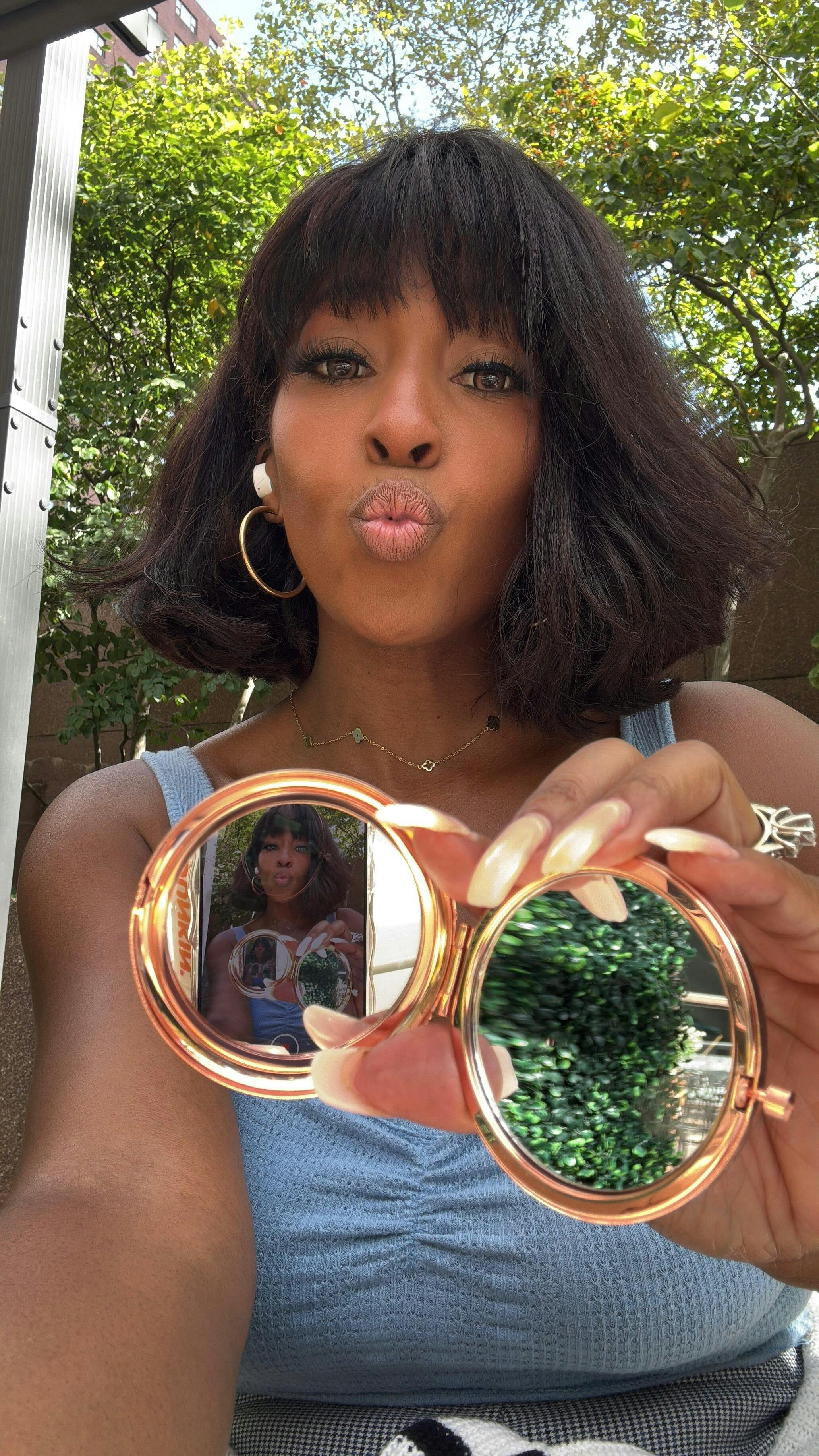 Give yourself a wink in this copper-colored compact mirror, engraved with love, logo.