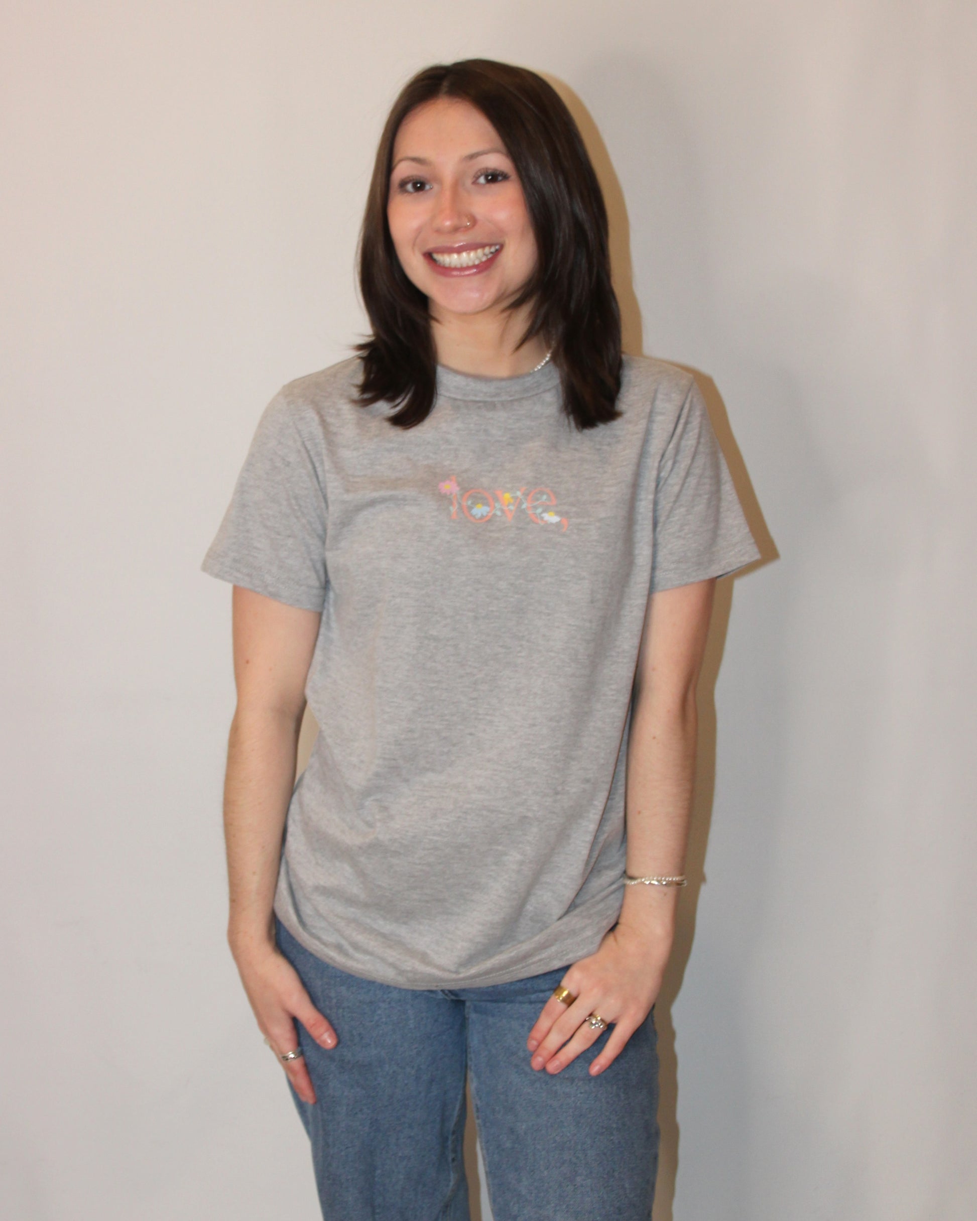 Dear love, how does your garden grow? Sweetest love, logo entwined in floral vine. Center chest print in light coral, mint green, pink, turquoise, yellow, and periwinkle on a long and lean fit grey heather crew tee.