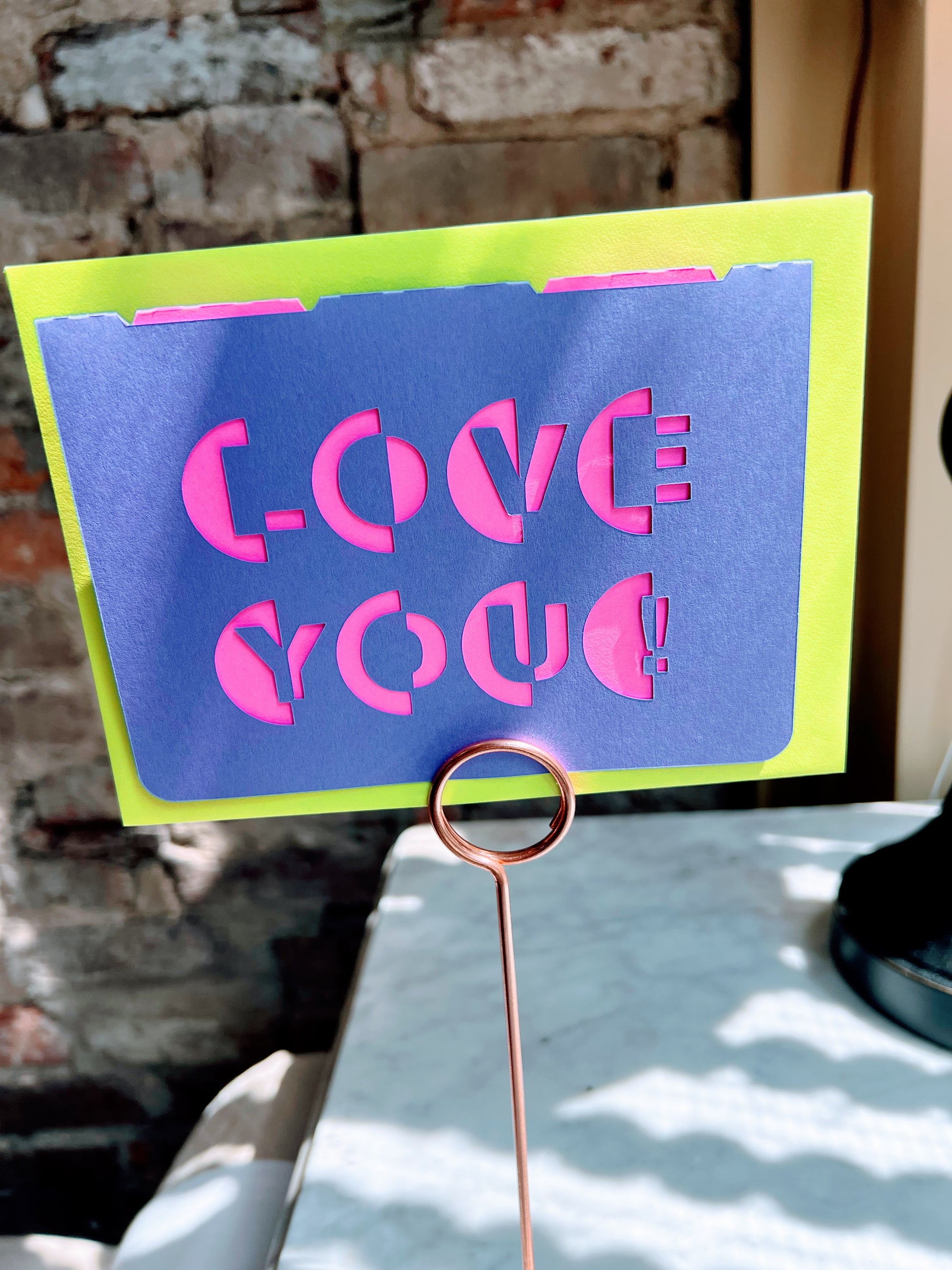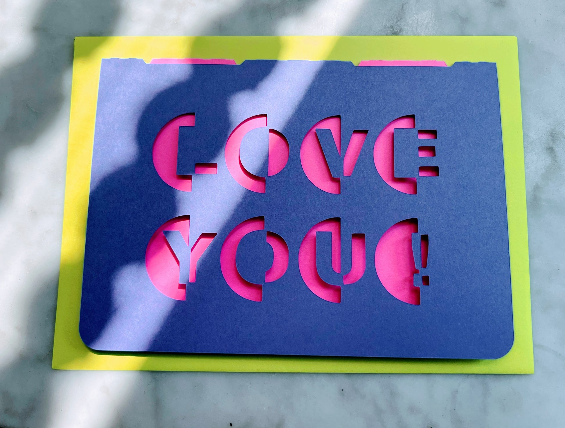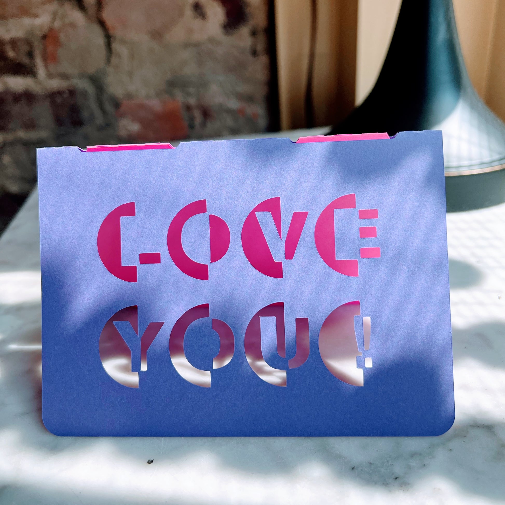 Fun way to say "Love you!" Unique half-circle design of cut out letters on purple paper, with hot pink interior paper. Comes with lime green envelope. Blank inside.