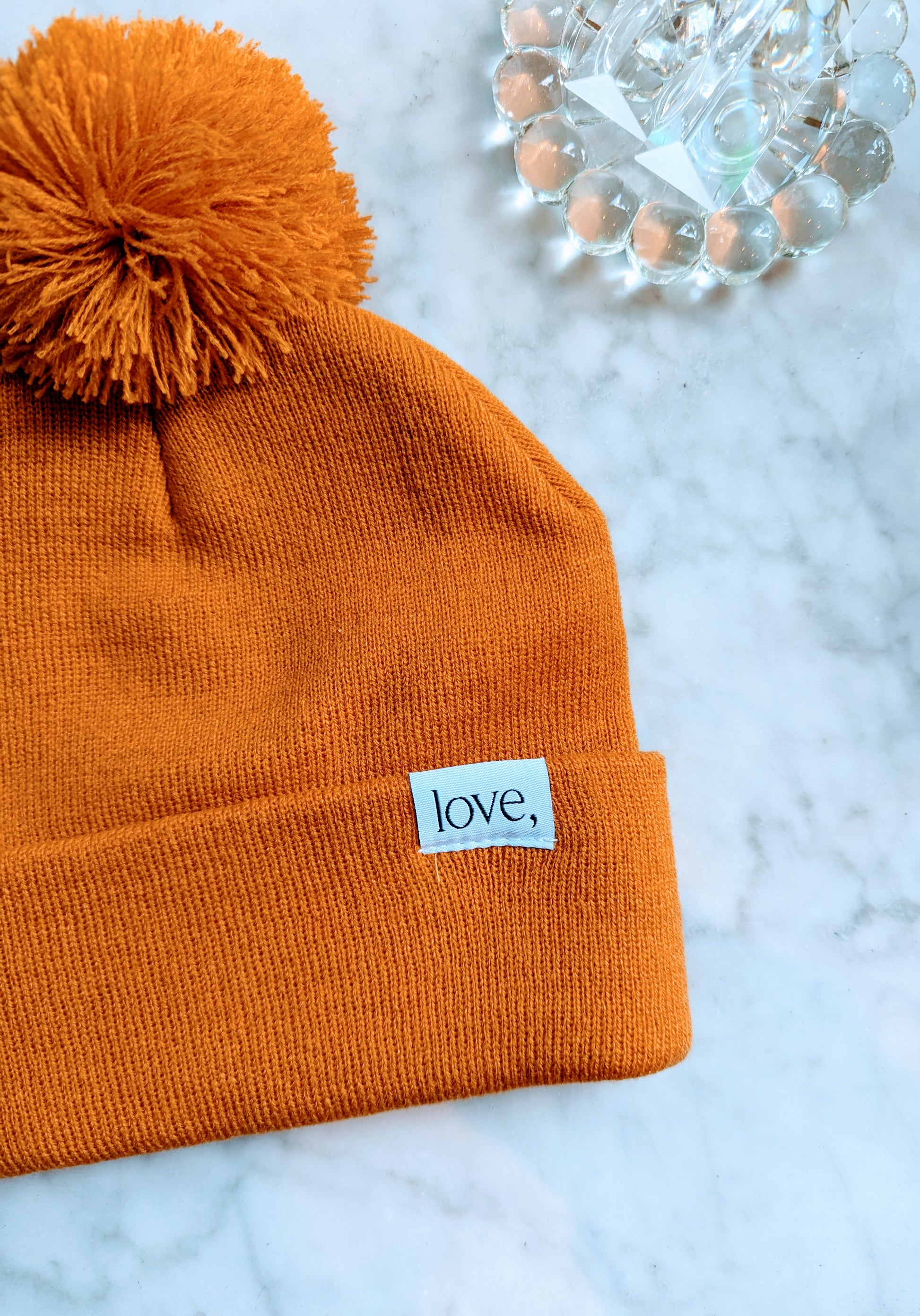 Stay cute and cozy in this classic pom hat the color of liquid caramel.