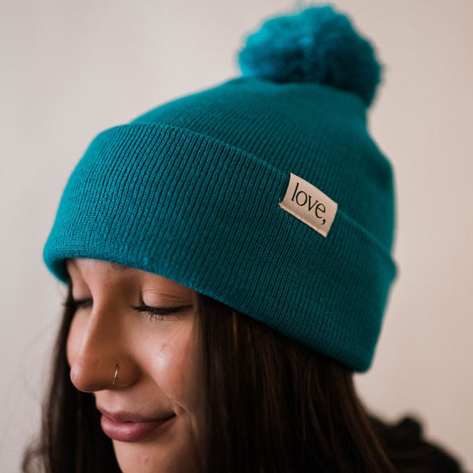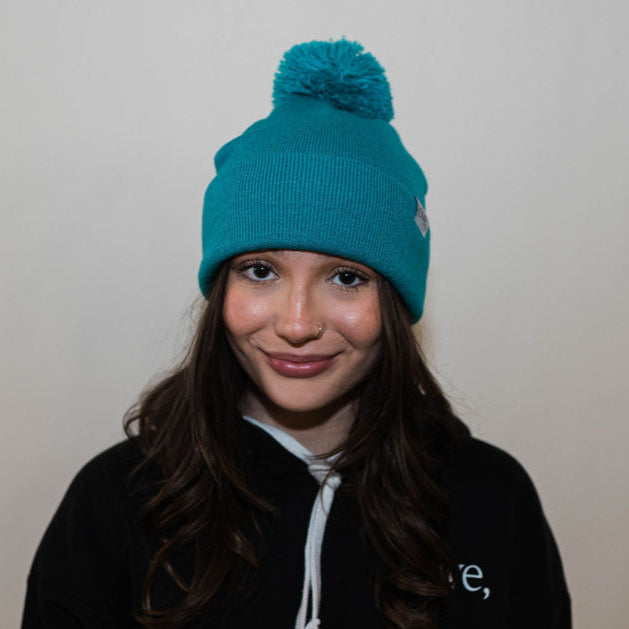 Stay cute and cozy in this classic pom hat the color of teal jade.