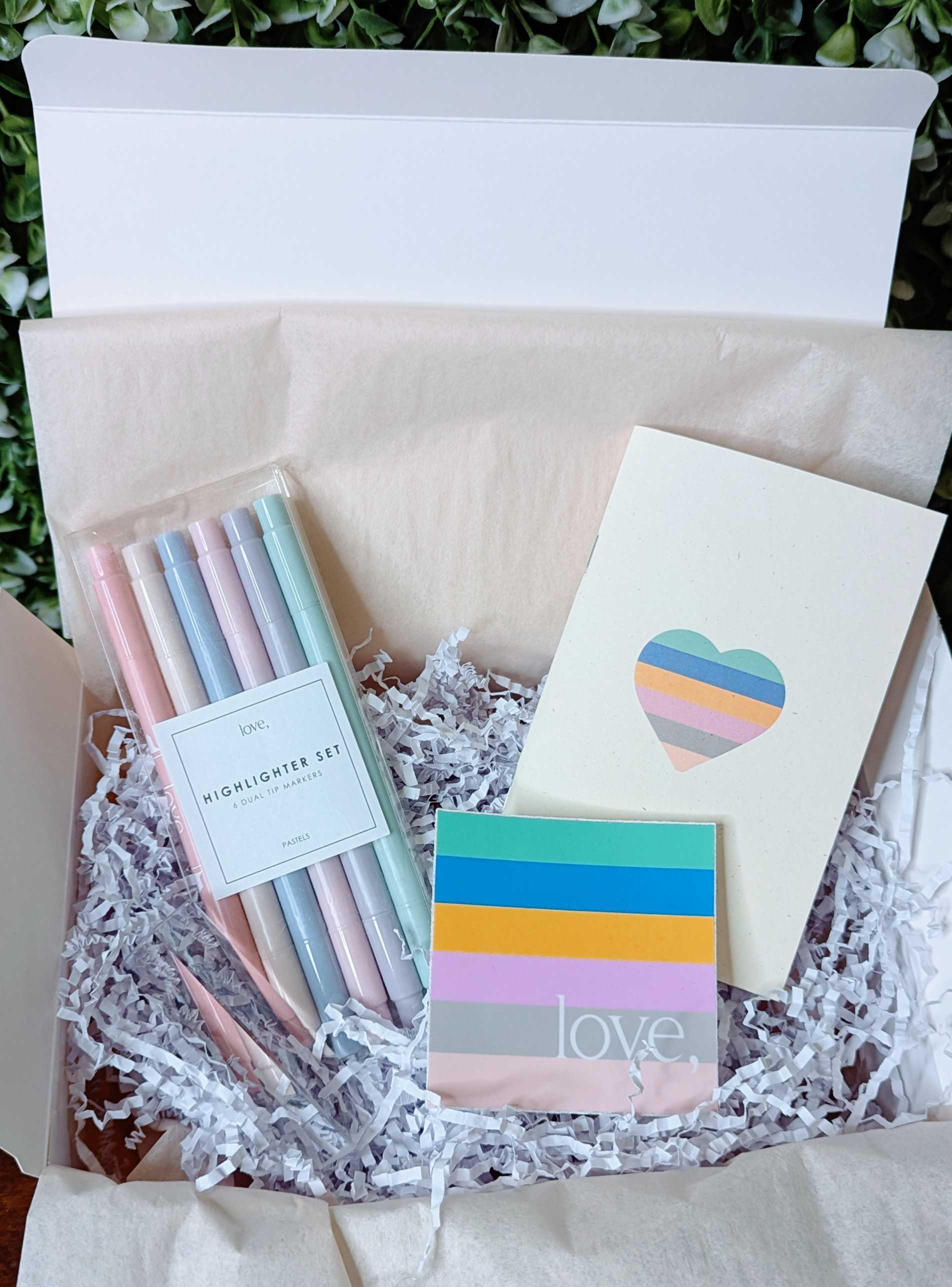 Elevate your writing experience with our Prism Stationery Set. This darling gift set includes a dot matrix pocket notebook, Prism sticker, pastel dual-tip highlighter set, and a mesmerizing glass prism that refracts light into rainbows. Indulge in the sensory pleasure of writing with this gift-ready set perfect for stationery lovers.